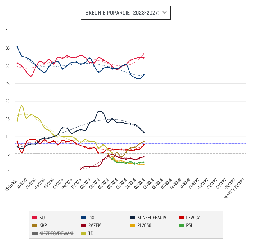 Jednak w zeszłym roku zdecydowali się na rozłam, pozostając jednocześnie częścią rządzącej koalicji Tuska. Słabo radzi sobie także PSL, na poziomie około 2,5%.